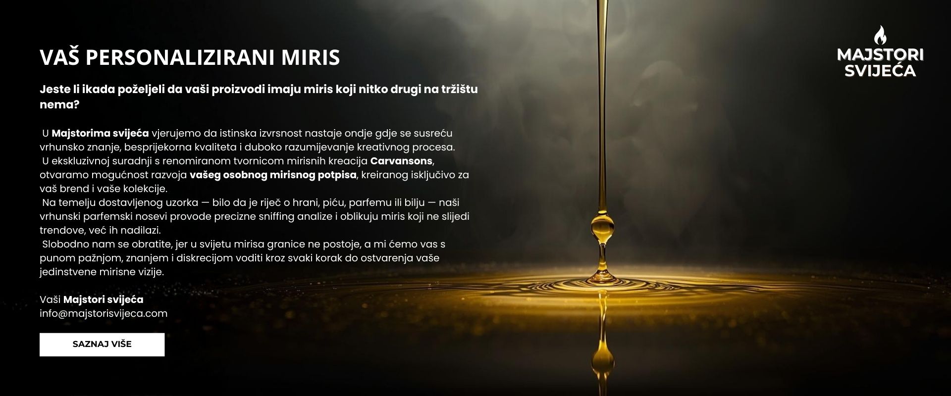 Osiguravajući najkvalitetnije proizvode dostupne na EU tržištu jamčimo Vam vrhunske materijale uz koje ćete postati pravi majstori svog zanata. Uz dugogodišnje iskustvo izrade svijeća i ostalih mirisnih proizvoda pružamo Vam podršku i dijelimo s vama svoje znanje i iskustvo.