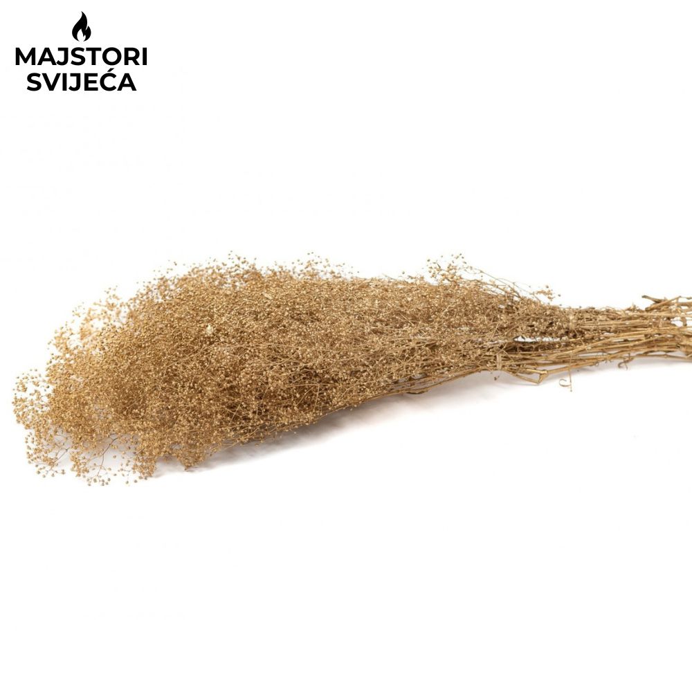 Mini gipsofila u zlatnoj boji jedno je od najtraženijih suhih cvjetova za dekoracije jer svojim sitnim cvjetićima stvara profinjen i luksuzan vizualni dojam. Ova nježna dekorativna biljka savršeno se uklapa u izradu svijeća, aranžmana, poklon pakiranja i raznih kreativnih projekata.
