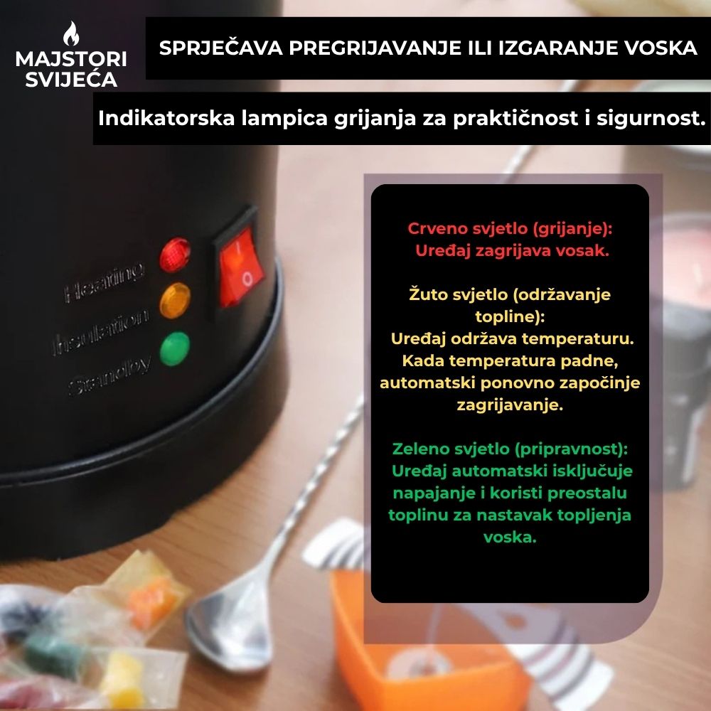 Zahvaljujući snažnom grijačem sustavu, vosak se topi brzo i ravnomjerno, bez pregrijavanja i bez gubitka kvalitete – što je ključno za izradu vrhunskih svijeća.