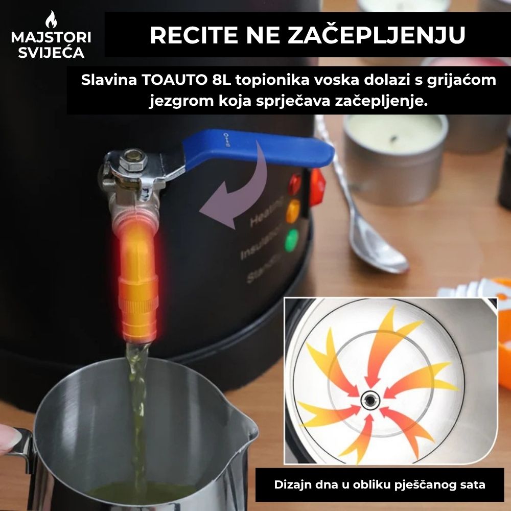 TOAUTO topionik za vosak kapaciteta 8 L predstavlja prijelaz iz hobija u ozbiljnu proizvodnju. Dizajniran za proizvođače svijeća koji žele veću brzinu, veću kontrolu i maksimalnu učinkovitost, ovaj uređaj omogućuje kontinuiran, stabilan i profesionalan rad bez improvizacija.